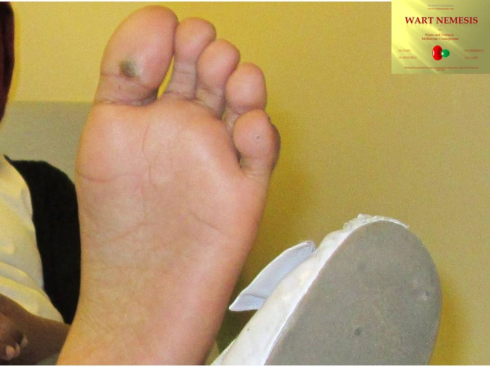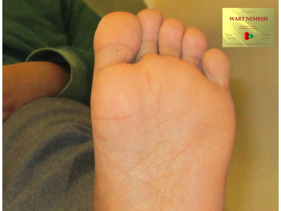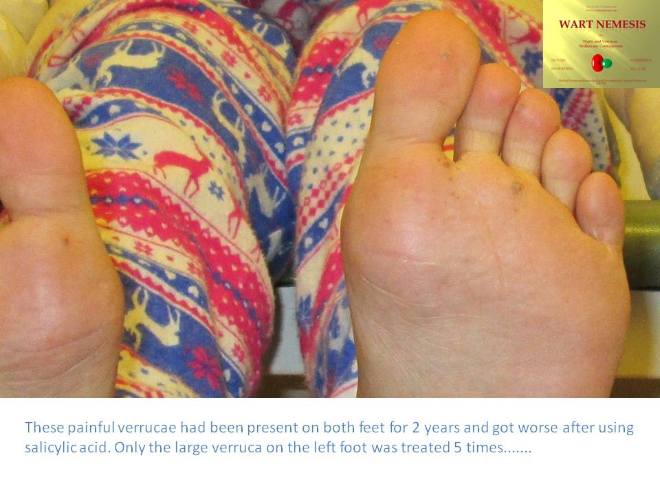 The pictures above were taken 8 weeks apart. Click on the pictures to enlarge them and then on the back button to return to the page. These Verrucae were painful and had been present for 3 years. Only the large verruca at the base of the big toe was treated after gentle abrasion. A dressing was applied, and no further applications were attempted. After 2 weeks the treated verruca had gone, and all the remaining verrucae on both feet were gone 4 weeks later. (See Promoted Autoimmunization above).